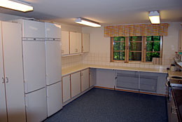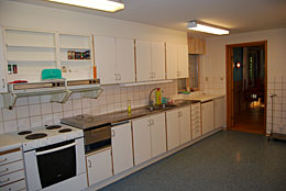 Köket är fullt utrustat för 50 personer. Här finns kyl-sval-frys, spis, stekbord, varmvatten och stora härliga arbetsytor.