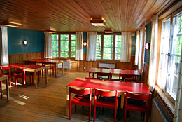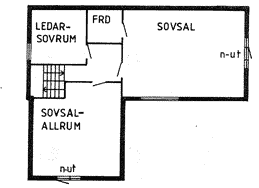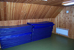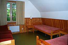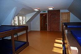 På ovanvåningen finns två sovsalar med ca 40 sovplatser samt ett mindre rum med två sängar.